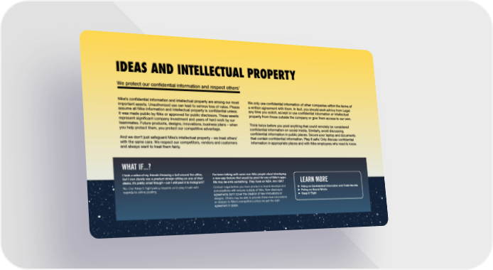 IDEAS AND INTELLECTUAL PROPERTY We protect our confidential information and respect others’ Nike’s confidential information and intellectual property are among our most important assets. Unauthorized use can lead to serious loss of value. Please assume all Nike information and intellectual property is confidential unless it was made public by Nike or approved for public disclosure. These assets represent significant company investment and years of hard work by our teammates. Future products, designs, innovations, business plans – when you help protect them, you protect our competitive advantage. And we don’t just safeguard Nike’s intellectual property – we treat others’ with the same care. We respect our competitors, vendors and customers and always want to treat them fairly. We only use confidential information of other companies within the terms of a written agreement with them. In fact, you should seek advice from Legal any time you solicit, accept or use confidential information or intellectual property from those outside the company or give them access to our own. Think twice before you post anything that could remotely be considered confidential information on social media. Similarly, avoid discussing confidential information in public places. Secure your laptop and documents that contain confidential information. Play it safe: Only discuss confidential information in appropriate places and with Nike employees who need to know. I took a video of my friends throwing a ball around the office, but I can clearly see a product design sitting on one of their desks. It’s pretty small though – can I still post it to Instagram? No. Our Keep It Tight policy requires us to play it safe with regards to online posting. I’ve been talking with some non-Nike people about developing a new app feature that would be great for one of Nike’s apps. We may be onto something. They have an NDA. Am I OK? Contact Legal before you have product or brand development conversations with anyone outside of NIke. Non-disclosure agreements don’t cover the creation of new innovations or designs. Others may be able to provide those new innovations or designs to Nike’s competitors unless we get the right agreement in place. WHAT IF...? LEARN MORE Policy on Confidential Information and Trade Secrets Policy on Social Media Keep It Tight 28