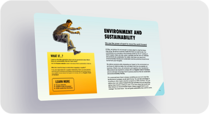 ENVIRONMENT AND SUSTAINABILITY We use the power of sport to move the world forward At Nike, we believe it’s not enough to simply adapt to what the future may bring. We strive to actively create the future we want to see. Our commitment is to innovate a new business model for the 21 st century, in which supply chains are lean, green, equitable and fair, and our materials and products are sustainable. No matter what team you may sit on, environmentally friendly and sustainable business practices should never be far from your thoughts. We deliver products while obsessing our impact on the environment, as we focus on what we make, how we make it and how we operate our business. What’s more, all contractors and suppliers who manufacture Nike product are required to comply with our Supplier Code of Conduct , and we strongly encourage them to pursue practices that are sustainable and environmentally friendly. On a personal level, there is always something we can do to help Nike be the kind of company we all want it to be. You can take advantage of recycling or other waste reduction programs on Nike premises. You can reduce your own carbon footprint through activities such as carpooling, taking mass transit or biking to work. If you have ideas that would help Nike reduce our environmental impact, please suggest them to your manager. You never know – the next great sustainability idea could be yours. I work on the Nike operations team and am passionate about Nike’s focus on sustainability. How do I learn more? Visit the Purpose website to learn more about Nike’s sustainability initiatives. What do I need to keep in mind when engaging a supplier? If you are responsible for a supplier relationship, follow our procurement, sourcing and compliance processes and procedures and always ensure any supplier knows about and agrees to comply with our Supplier Code of Conduct . LEARN MORE Purpose Website Supplier Code of Conduct Code Leadership Standards WHAT IF...? 32