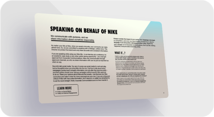 SPEAKING ON BEHALF OF NIKE We communicate with purpose, and we share information about ourselves responsibly No matter your title at Nike, when you speak externally, your comments can make global news. So, we are committed to speaking with a strategic, unified voice. This ensures we protect the brand and only share accurate and consistent information. If you are speaking while using your Nike title – in an interview, at a conference, for an academic case study or any other public-facing opportunity – you must get approval from Corporate Communications. Nike only communicates through approved channels, as who we share information with can be just as important as what we say. Now let’s talk social media. You can of course use social media for work and play, but be thoughtful when you bring Nike into the mix. Feel free to talk about brand campaigns, product and company information, but only after they become public – and third parties should never discuss campaigns without specific Nike approval to do so. Share your opinions about Nike and the industry – just disclose your Nike connection and make it clear the views expressed are your own. If you see a blog post critical of Nike with inaccurate information, don’t respond, no matter how tempting it is to set the record straight. Notify Corporate Communications and let them handle it. Always consider the impact of your words. Don’t disparage individuals or competitors, and never use discriminatory, threatening or abusive language. If you encounter a damaging incident online, report it to your manager or to Corporate Communications. Don’t act like nothing happened; everyone sees everything online. I work in a store and occasionally someone who I think is a social media blogger comes in and films in the store for their YouTube channel. What should I do? It’s OK for customers to take photos or film for their own personal use while they’re in our stores, but filming or taking photos for any other reason must be approved by our Media Relations teams. Politely let the blogger know that they are welcome to stay and shop but in order to film in the store, they will need to contact Corporate Communications for permission. I was asked to be on a panel discussion at my alma mater. No media will be there, and just a couple dozen students will be in attendance. Am I OK just accepting the invitation? While it seems to be a great opportunity for you, there are some steps you need to take to make sure it’s OK to accept the speaking engagement. Submit an External Engagement Request Form , and Corporate Communications will review the request and contact you. LEARN MORE Policy on Social Media Policy on External Engagements WHAT IF...? 33