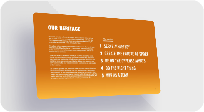 OUR HERITAGE SERVE ATHLETES* CREATE THE FUTURE OF SPORT BE ON THE OFFENSE ALWAYS DO THE RIGHT THING WIN AS A TEAM The Maxims On a cold, rainy day in Portland, Oregon, a coach and his former athlete met for lunch to discuss a possible business partnership. One hour later, Phil Knight and Bill Bowerman shook hands, founding the company that would later become Nike. It was January 25, 1964. The culture of the company they founded can be seen in that handshake: Trust. Honesty. Shared excitement. Commitment. The ideals embodied in that moment come to life every time somebody interacts with us, our brands and our business. Today, we serve our athletes in virtually all countries around the world. It’s our relentless focus on doing right for the consumer that has driven our growth over the decades. Continuing to capture that growth requires sustained focus and commitment. Like the athletes who inspire us, we work hard every day. Our values, reflected in our Maxims, are unbreakable and everlasting. As our team grows in size, we remain united by a love of sport. It teaches us to be competitive, but always play fair. To be inclusive, collaborative and respectful. To give back by improving lives in the communities where we live and work – proving that our commitment to athletes isn’t just what we do, but in how we do it. We are passionate about our own potential, and when we’re working together there’s no telling what we can do. 1 2 3 4 5 2