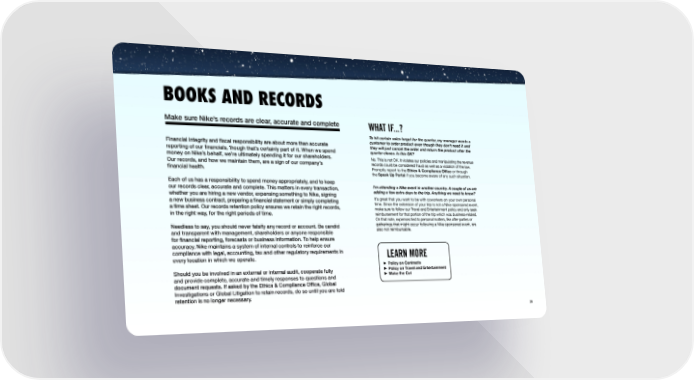 BOOKS AND RECORDS Make sure Nike’s records are clear, accurate and complete WHAT IF...? Financial integrity and fiscal responsibility are about more than accurate reporting of our financials, though that’s certainly part of it. When we spend money on Nike’s behalf, we’re ultimately spending it for our shareholders. Our records, and how we maintain them, are a sign of our company’s financial health. Each of us has a responsibility to spend money appropriately, and to keep our records clear, accurate and complete. This matters in every transaction, whether you are hiring a new vendor, expensing something to Nike, signing a new business contract, preparing a financial statement or simply completing a time sheet. Our records retention policy ensures we retain the right records, in the right way, for the right periods of time. Needless to say, you should never falsify any record or account. Be candid and transparent with management, shareholders or anyone responsible for financial reporting, forecasts or business information. To help ensure accuracy, Nike maintains a system of internal controls to reinforce our compliance with legal, accounting, tax and other regulatory requirements in every location in which we operate. Should you be involved in an external or internal audit, cooperate fully and provide complete, accurate and timely responses to questions and document requests. If asked by the Ethics & Compliance Office, Global Investigations or Global Litigation to retain records, do so until you are told retention is no longer necessary. To hit certain sales target for the quarter, my manager wants a customer to order product even though they don’t need it and they will just cancel the order and return the product after the quarter closes. Is this OK? No. This is not OK. It violates our policies and manipulating the revenue records could be considered fraud as well as a violation of the law. Promptly report to the Ethics & Compliance Office or through the Speak Up Portal if you become aware of any such situation. I’m attending a Nike event in another country. A couple of us are adding a few extra days to the trip. Anything we need to know? It’s great that you want to be with coworkers on your own personal time. Since the extension of your trip is not a Nike-sponsored event, make sure to follow our Travel and Entertainment policy and only seek reimbursement for that portion of the trip which was business-related. On that note, expenses tied to personal matters, like after-parties or gatherings that might occur following a Nike sponsored event, are also not reimbursable. LEARN MORE Policy on Contracts Policy on Travel and Entertainment Make the Cut 29