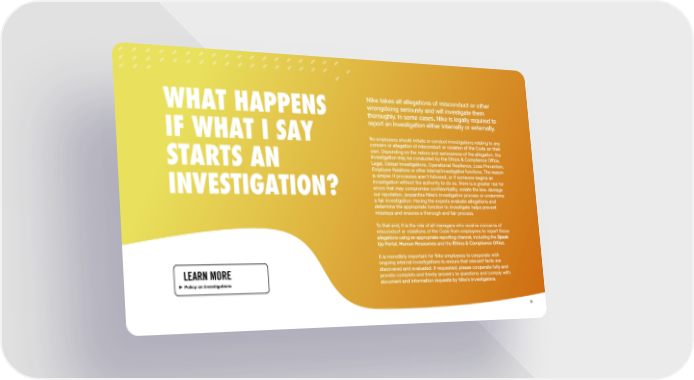 Nike takes all allegations of misconduct or other wrongdoing seriously and will investigate them thoroughly. In some cases, Nike is legally required to report an investigation either internally or externally. No employees should initiate or conduct investigations relating to any concern or allegation of misconduct or violation of the Code on their own. Depending on the nature and seriousness of the allegation, the investigation may be conducted by the Ethics & Compliance Office, Legal, Global Investigations, Operational Resilience, Loss Prevention, Employee Relations or other internal investigative functions. The reason is simple: If processes aren’t followed, or if someone begins an investigation without the authority to do so, there is a greater risk for errors that may compromise confidentiality, violate the law, damage our reputation, jeopardize Nike’s investigative process or undermine a fair investigation. Having the experts evaluate allegations and determine the appropriate function to investigate helps prevent missteps and ensures a thorough and fair process. To that end, it is the role of all managers who receive concerns of misconduct or violations of the Code from employees to report those allegations using an appropriate reporting channel, including the Speak Up Portal , Human Resources and the Ethics & Compliance Office . It is incredibly important for Nike employees to cooperate with ongoing internal investigations to ensure that relevant facts are discovered and evaluated. If requested, please cooperate fully and provide complete and timely answers to questions and comply with document and information requests by Nike’s investigators. LEARN MORE Policy on Investigations WHAT HAPPENS IF WHAT I SAY STARTS AN INVESTIGATION? 10