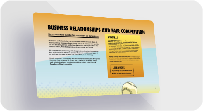 BUSINESS RELATIONSHIPS AND FAIR COMPETITION We compete hard but play fair, everywhere we do business At Nike, we are fortunate that many companies worldwide would like to do business with us. Consequently, we choose who we do business with carefully. Our aim is to always create productive relationships with organizations that share our values, meet their commitments and comply with the law. We compete fairly and comply with all applicable antitrust and competition laws in the countries where we operate. We should avoid discussing any of our business strategies or plans with competitors, even informally. Nike is committed to complying with anti-money laundering laws throughout the world. As a company, we simply won’t tolerate or participate in any such activity. As always, report any suspicious activity to the Ethics & Compliance Office immediately. I’m a store athlete and I have some friends who work in competitor stores in the mall. Sometimes they ask me about our hourly sales targets and how we price footwear for the next season. Is it OK to give them that information if I keep it vague? No. Sales targets, future product pricing and any financial information are confidential information. In addition to violating agreements you may have signed with Nike when you were hired, you also may be violating competition laws that limit these discussions. We must independently set our product prices. My retail customer keeps discounting below our recommended price. Can I ask them to maintain pricing as recommended by Nike? No. We cannot control the prices that our distributors and retailers charge in the marketplace. LEARN MORE Competition Law Compliance Program Policy on Contracts Policy on Global Spend Authorization WHAT IF...? 21