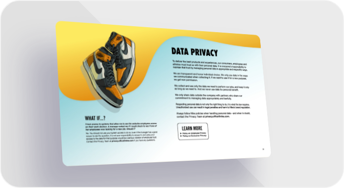 DATA PRIVACY To deliver the best products and experiences, our consumers, employees and athletes must trust us with their personal data. It is everyone’s responsibility to maintain that trust by managing personal data in appropriate and respectful ways. We are transparent and honor individual choice. We only use data in the ways we communicated when collecting it. If we want to use it for a new purpose, we get new permission. We collect and use only the data we need to perform our jobs, and keep it only as long as we need to. And we never use data for personal benefit. We only share data outside the company with partners who share our commitment to managing data appropriately and lawfully. Respecting personal data is not only the right thing to do, it is what the law requires. Unauthorized use can result in legal penalties and harm to Nike’s brand reputation. Always follow Nike policies when handling personal data – and when in doubt, contact the Privacy Team at [email protected] . LEARN MORE Policy on Employee Privacy Policy on Consumer Privacy I have access to systems that allow me to see the websites employees access on their work devices. A manager asked me if I could check to see if one of her employees was looking for a new job. Should I? No. You should not use your system access to do so. Even if the manager has a good reason to ask the question, it is not your responsibility to answer it, and using your access to the data for that purpose would be a serious violation of employee trust. Contact the Privacy Team at [email protected] if you have any questions. WHAT IF...? 23