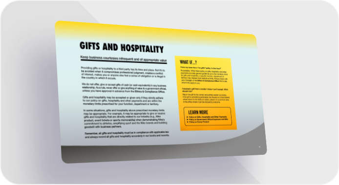 GIFTS AND HOSPITALITY Keep business courtesies infrequent and of appropriate value Providing gifts or hospitality to a third party has its time and place. But it’s to be avoided when it compromises professional judgment, creates a conflict of interest, makes you or anyone else feel a sense of obligation or is illegal in the country in which it occurs. We do not offer, give or accept gifts of cash (or cash equivalents) in any business relationship. As a rule, never offer or give anything of value to a government official, unless you have approval in advance from the Ethics & Compliance Office . Gifts and hospitality may be accepted or given only if they strictly adhere to our policy on gifts, hospitality and other payments and are within the monetary limits prescribed for your function, department or territory. In some situations, gifts and hospitality above prescribed monetary limits may be appropriate. For example, it may be appropriate to give or receive gifts and hospitality that are directly related to our industry (e.g., Nike product, event tickets or sports memorabilia) when demonstrating Nike’s commitment to athletes, amplifying sport and the Nike brands and building goodwill with business partners. Remember, all gifts and hospitality must be in compliance with applicable law and always record all gifts and hospitality accurately in our books and records. I hear my team has a “no gifts” policy. Is that true? It’s possible. While Nike’s policy on gifts, hospitality and other payments provides general guidelines as to the monetary limits for gifts and hospitality, a specific function, department or territory may impose more restrictive limits. Always check with your manager or the Ethics & Compliance Office first to see what limits apply to you. I received a gift from a vendor I know I can’t accept. What should I do? Return the gift to the vendor and politely explain our policy. If the gift is something perishable, like flowers or a food basket, where return is not really an option, place it in a common area in the office where it can be enjoyed by everyone. WHAT IF...? LEARN MORE Policy on Gifts, Hospitality and Other Payments Policy on Government Official Expenses and Gifts Policy on Comp Product 18