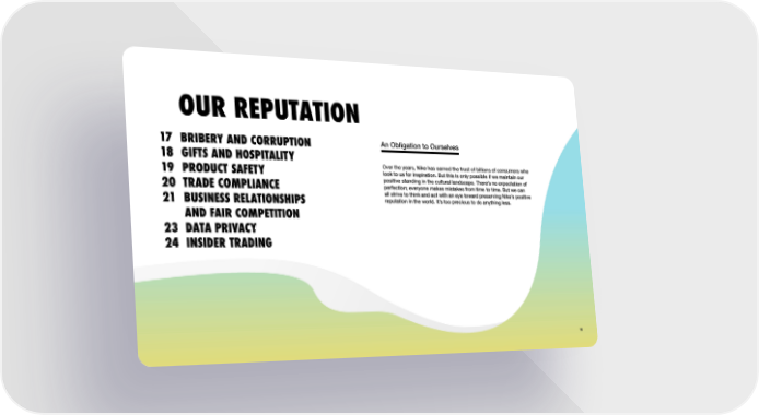 16 OUR REPUTATION BRIBERY AND CORRUPTION GIFTS AND HOSPITALITY PRODUCT SAFETY TRADE COMPLIANCE BUSINESS RELATIONSHIPS AND FAIR COMPETITION DATA PRIVACY INSIDER TRADING 17 18 19 20 21 23 24 An Obligation to Ourselves Over the years, Nike has earned the trust of billions of consumers who look to us for inspiration. But this is only possible if we maintain our positive standing in the cultural landscape. There’s no expectation of perfection; everyone makes mistakes from time to time. But we can all strive to think and act with an eye toward preserving Nike’s positive reputation in the world. It’s too precious to do anything less. 16