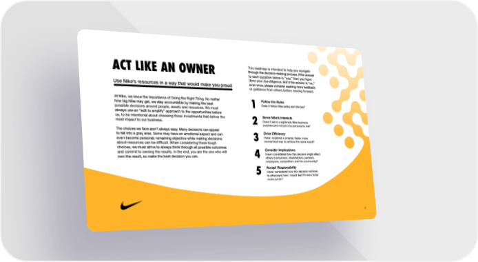 ACT LIKE AN OWNER Use Nike’s resources in a way that would make you proud At Nike, we know the importance of Doing the Right Thing. No matter how big Nike may get, we stay accountable by making the best possible decisions around people, assets and resources. We must always use an “edit to amplify” approach to the opportunities before us, to be intentional about choosing those investments that deliver the most impact to our business. The choices we face aren’t always easy. Many decisions can appear to fall into a gray area. Some may have an emotional aspect and can even become personal; remaining objective while making decisions about resources can be difficult. When considering these tough choices, we must strive to always think through all possible outcomes and commit to owning the results. In the end, you are the one who will own the result, so make the best decision you can. This roadmap is intended to help you navigate through the decision-making process: if the answer to each question below is “yes,” then you have done your due diligence. But if the answer is “no,” even once, please consider seeking more feedback or guidance from others before moving forward. 1 Follow the Rules Does it follow Nike policy and the law? 2 Serve Nike’s Interests Does it serve a legitimate Nike business purpose and not just one personal to me? 3 Drive Efficiency Have I explored a smarter, faster, more economical way to achieve the same result? 4 Consider Implications Have I considered how this decision might affect others (consumers, shareholders, partners, employees, competitors and the community)? 5 Accept Responsibility Have I considered how this decision will look to others and how I would feel if it were to be made public? 5