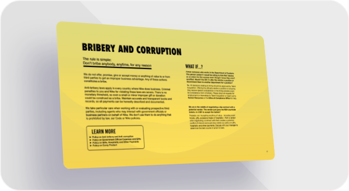 BRIBERY AND CORRUPTION The rule is simple: Don’t bribe anybody, anytime, for any reason WHAT IF...? We do not offer, promise, give or accept money or anything of value to or from third parties to get an improper business advantage. Any of these actions constitutes a bribe. Anti-bribery laws apply in every country where Nike does business. Criminal penalties to you and Nike for violating these laws are severe. There is no monetary threshold, so even a small or minor improper gift or donation could be construed as a bribe. Maintain accurate and transparent books and records, so all payments can be honestly described and documented. We take particular care when working with or evaluating prospective third parties, including agents who may interact with government officials or business partners on behalf of Nike. We don’t use them to do anything that is prohibited by law, our Code or Nike policies. I know someone who works in the Department of Customs. This person asked if I would be willing to hire their relative as an intern for the summer even though I know they aren’t qualified. Would it be OK if I offer the relative a position or recommend them to another department for a position? No. All decisions relating to hiring should be approved by Talent Acquisition. Offering the official’s relative a position or ensuring they receive special consideration in the hiring process could be considered a form of bribery. Please direct all requests for employment or internships to Talent Acquisition or reach out to Human Resources or the Ethics & Compliance Office for help. We are in the middle of negotiating a big contract with a potential vendor. The vendor just gave me NBA courtside tickets. Is it OK to accept the tickets? Probably not. Accepting anything of value – including event tickets, gifts, excessive meals or hospitality – from a vendor while negotiating a contract with them creates a potential conflict of interest and could also violate our policy on gifts, hospitality and other payments. Discuss with your manager to determine the best course of action to take. LEARN MORE Policy on Anti-bribery and Anti-corruption Policy on Government Official Expenses and Gifts Policy on Gifts, Hospitality and Other Payments Policy on Comp Product 17