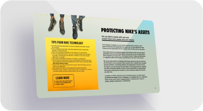 PROTECTING NIKE’S ASSETS We use Nike’s assets with care and protect them from waste, loss and misuse From laptops to staplers to room-sized manufacturing machines, Nike gives us the tools and equipment we need to do our jobs effectively. Nike trusts us to be responsible and not wasteful with the Nike stuff we are given. This is also true for non-physical assets. Use company email and web-based applications and accounts responsibly. Personal use of your company phone and computer is of course fine – as long as it doesn’t violate any Nike policy or negatively affect performance, productivity or the work environment. We are all responsible for keeping technology resources safe by following all information security policies. Never tamper with or disable Nike-managed security software, and always abide by the agreements we enter into for the right to use and access the information, computing resources, software and other proprietary assets of others. We are responsible for appropriately storing and retaining the contracts or other business related documents we enter into. In addition to Nike’s physical and non-physical assets, be smart about protecting the assets of your colleagues, our suppliers and our customers. Keep an eye out for theft, misappropriation, embezzlement, waste or abuse, whether intentional or unintentional. TIPS FROM NIKE TECHNOLOGY Use Nike-approved applications to send confidential information outside the company. Save confidential information using Nike-approved tools, not personal laptops or portable devices. Never share nonpublic information on the internet or on social media. Lock up unattended devices. Lock your computer screen when you leave your desk. Avoid leaving work devices in vehicles. If it can’t be avoided, keep them out of sight. Don’t leave confidential information on printers or whiteboards. Avoid viruses and malware; don’t click on attachments or links you don’t trust. (If you receive an email with an attachment you don’t trust, you should contact Nike Cyber Defense Center ) Never share your Nike password with anyone. Nike Technology will never ask for your password. Be unique; don’t use your Nike password for external accounts. Always be aware of what’s on your screen while in an airplane, on a train or any other location someone might be able to see your screen. LEARN MORE Information Security Program Policy on Acceptable Use Keep It Tight 26
