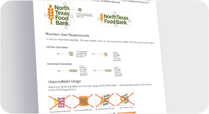 Logo Usage Clear Space Requirements Clear space is the amount of space around the logo that must be free from text and graphics to ensure that the logo stands out. Please note that it is acceptable to apply the logo over subtle background textures or light areas in photography where maximum legibility can still be achieved. Use the lowercase “o” as a sizing key for determining clear space Minimum Size Requirements To ensure maximum legibility, the logo should never be reproduced any smaller than the sizes shown below. Vertical Orientation Do not reproduce Do not 1/2” any smaller than 32 px reproduce 1/2” tall for print any smaller applications. than 32 px tall for digital applications. Horizontal Orientation Do not Do not reproduce reproduce any smaller 22 px any smaller 5/16” than 5/16” tall for print than 22 px applications. tall for digital applications. Unacceptable Usage Below are some examples of incorrect usage of the NTFB logo. These examples apply to all versions in the NTFB logo library. Do not change the logo colors. Do not use old NTFB logos. Do not distort/redraw the logo. Do not rotate the logo. Do not set the Feeding America Do not use the logo over dark, Do not use the reversed logo on Do not use the logo on solid tagline with the logo. Use one complex photography if photography with insufficient background colors that make any of the approved Member of legibility is an issue. contrast. part of the logo difficult to see. Feeding America logos. NTFB Style Guidelines 3