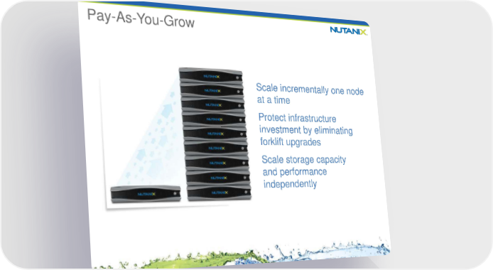 Pay-As-You-Grow Scale incrementally one node at a time Protect infrastructure investment by eliminating forklift upgrades Scale storage capacity and performance independently 8 Nutanix Page 7 Page 9