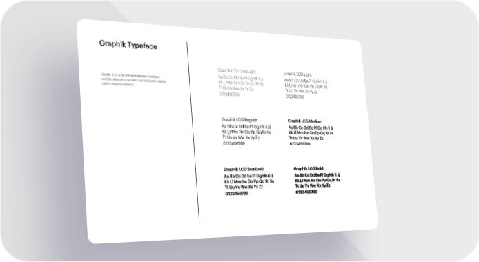 Aa Bb Cc Dd Ee Ff Gg Hh Ii Jj Kk Ll Mm Nn Oo Pp Qq Rr Ss Tt Uu Vv Ww Xx Yy Zz Graphik LCG Extra Light 0123456789 Aa Bb Cc Dd Ee Ff Gg Hh Ii Jj Kk Ll Mm Nn Oo Pp Qq Rr Ss Tt Uu Vv Ww Xx Yy Zz Graphik LCG Light 0123456789 Aa Bb Cc Dd Ee Ff Gg Hh Ii Jj Kk Ll Mm Nn Oo Pp Qq Rr Ss Tt Uu Vv Ww Xx Yy Zz Graphik LCG Regular 0123456789 Aa Bb Cc Dd Ee Ff Gg Hh Ii Jj Kk Ll Mm Nn Oo Pp Qq Rr Ss Tt Uu Vv Ww Xx Yy Zz Graphik LCG Medium 0123456789 Aa Bb Cc Dd Ee Ff Gg Hh Ii Jj Kk Ll Mm Nn Oo Pp Qq Rr Ss Tt Uu Vv Ww Xx Yy Zz Graphik LCG Semibold 0123456789 Aa Bb Cc Dd Ee Ff Gg Hh Ii Jj Kk Ll Mm Nn Oo Pp Qq Rr Ss Tt Uu Vv Ww Xx Yy Zz Graphik LCG Bold 0123456789 Graphik Typeface Graphik LCG is our primary typeface. It has been carefully selected to represent the brand and must be used to retain consistency.