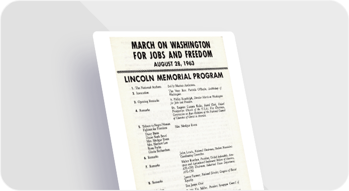 Official Program for the March on Washington (1963)This program listed the events scheduled at the Lincoln Memorial during the August 28, 1963, March on Washington for Jobs and Freedom. OriginalPhotoTranscript