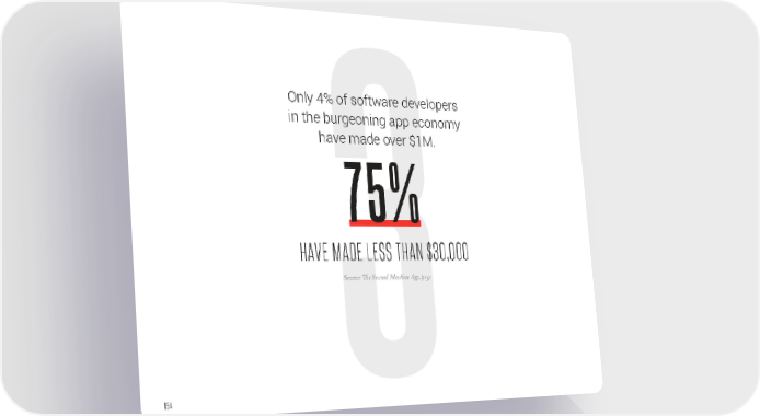 Only 4% of software developers in the burgeoning app economy have made over $1M. 75% HAVE MADE LESS THAN $30,000 Source: !e Second Machine Age, p151 154