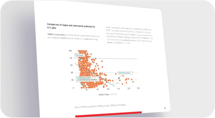 Comparison of wages and automation potential for Note: The analysis used “detailed work activities,” as defined by U.S. jobs O’NET, a program sponsored by the U.S. Department of Labor, Employment and Training Administration. Using a linear model, 1 Ability to automate, % of time spent on acitivities that can be we find the correlation between wages and automatability in the automated by adapting currently demonstrated technology. U.S. economy to be significant (p-value < 0.01), but with a high 2 degree of variability (r = 0.19). 100 80 60 40 20 2 r = 0.19 0 20 40 60 80 100 120 Hourly wage, $ per hour Source: O’NET 2014 database: McKinsey analysis, McKinsey & Company. 107