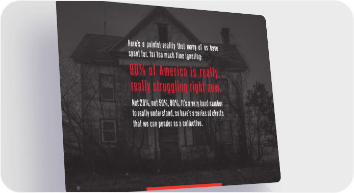 Here’s a painful reality that many of us have spent far, far too much time ignoring: 90% of America is really, really struggling right now. Not 20%, not 50%, 90%. It’s a very hard number to really understand, so here’s a series of charts that we can ponder as a collective. 22