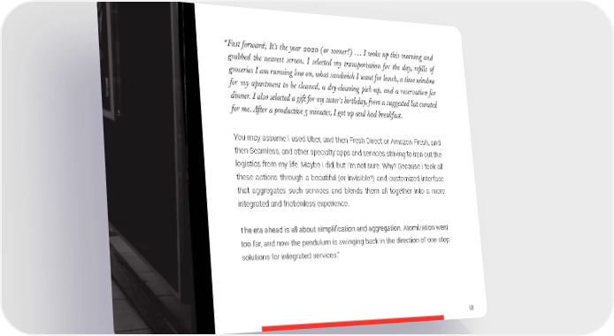 “ Fast forward; It’s the year 2020 (or sooner!) … I woke up this morning and grabbed the nearest screen. I selected my transportation for the day, refills of groceries I am running low on, what sandwich I want for lunch, a time window for my apartment to be cleaned, a dry-cleaning pick-up, and a reservation for dinner. I also selected a gift for my sister’s birthday, from a suggested list curated for me. After a productive 5 minutes, I got up and had breakfast. You may assume I used Uber, and then Fresh Direct or Amazon Fresh, and then Seamless, and other specialty apps and services striving to iron out the logistics from my life. Maybe I did, but I’m not sure. Why? Because I took all these actions through a beautiful (or invisible?) and customized interface that aggregates such services and blends them all together into a more integrated and frictionless experience. The era ahead is all about simplification and aggregation. Atomization went too far, and now the pendulum is swinging back in the direction of one-stop solutions for integrated services.” 113