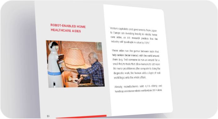 ROBOT-ENABLED HOME Venture capitalists and governments from Japan HEALTHCARE AIDES to Europe are investing heavily in robotic home care aides, as ABI research predicts that the industry will ‘quadruple in value by 2025.’ These aides run the gamut between tools that help seniors better interact with the world around them (e.g. find someone to run an errand for a small fee) to tools that allow humans to act more like nurse practitioners (the computer is doing the diagnostic work, the human adds a layer of real- world logic onto the whole affair). Credit: http://thenetwork.cisco.com Already, manufacturers sold 4,416 elderly and handicap assistance robots worldwide in 2014 alone. 134