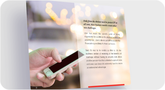 Aside from the obvious need to protect IP at all costs, these business models create other new challenges. Uber has made the specific point of being responsible for as little in the physical world as it possibly can—Uber’s drivers are left to assume the financial responsibility for their car leases. Sure it’s nice to be nimble as Uber is—it’s the business version of receiving all the benefits of marriage without having to actually care about another person—but that unlimited supply of zeros and ones can mean it’s extremely hard to create an entrenched advantage. 66