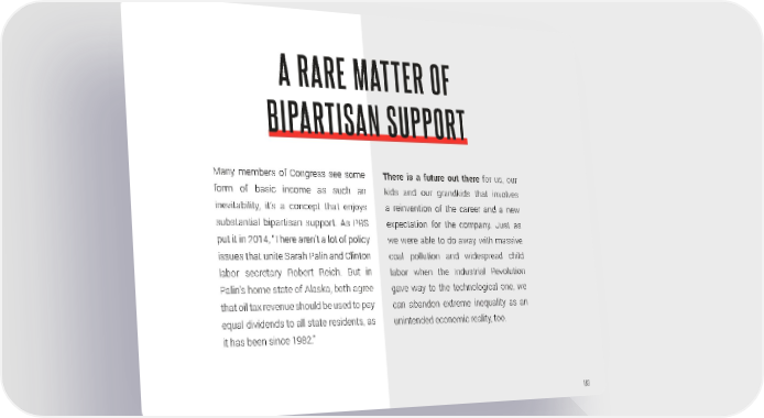 A RARE MATTER OF BIPARTISAN SUPPORT Many members of Congress see some There is a future out there for us, our form of basic income as such an kids and our grandkids that involves inevitability, it’s a concept that enjoys a reinvention of the career and a new substantial bipartisan support. As PBS expectation for the company. Just as put it in 2014, “There aren’t a lot of policy we were able to do away with massive issues that unite Sarah Palin and Clinton coal pollution and widespread child labor secretary Robert Reich. But in labor when the Industrial Revolution Palin’s home state of Alaska, both agree gave way to the technological one, we that oil tax revenue should be used to pay can abandon extreme inequality as an equal dividends to all state residents, as unintended economic reality, too. it has been since 1982.” 163