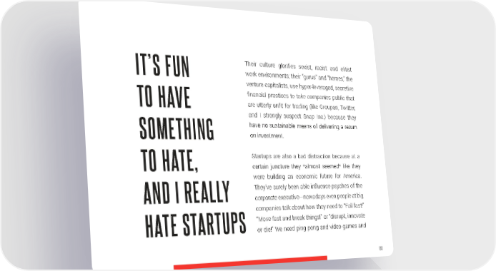 Their culture glorifies sexist, racist and elitist IT’S FUN work environments; their “gurus” and “heroes,” the venture capitalists, use hyper-leveraged, secretive financial practices to take companies public that TO HAVE are utterly unfit for trading (like Groupon, Twitter, and I strongly suspect Snap Inc.) because they have no sustainable means of delivering a return SOMETHING on investment. Startups are also a bad distraction because at a TO HATE, certain juncture they *almost seemed* like they were building an economic future for America. They’ve surely been able influence psyches of the AND I REALLY corporate executive—nowadays even people at big companies talk about how they need to “Fail fast!” “Move fast and break things!” or “disrupt, innovate HATE STARTUPS or die!” We need ping pong and video games and 155