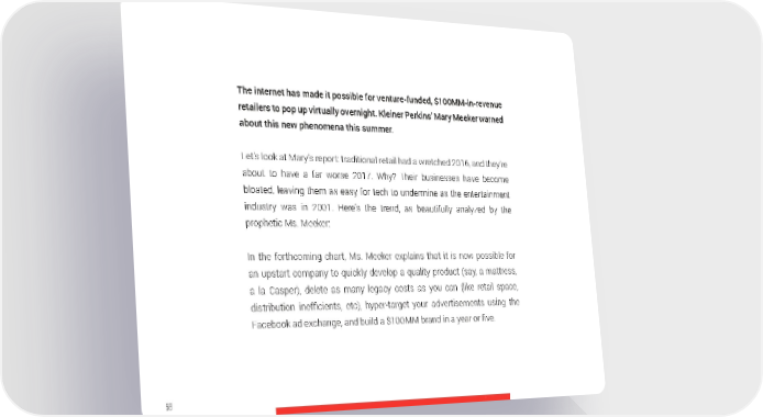 The internet has made it possible for venture-funded, $100MM-in-revenue retailers to pop up virtually overnight. Kleiner Perkins’ Mary Meeker warned about this new phenomena this summer. Let’s look at Mary’s report: traditional retail had a wretched 2016, and they’re about to have a far worse 2017. Why? Their businesses have become bloated, leaving them as easy for tech to undermine as the entertainment industry was in 2001. Here’s the trend, as beautifully analyzed by the prophetic Ms. Meeker: In the forthcoming chart, Ms. Meeker explains that it is now possible for an upstart company to quickly develop a quality product (say, a mattress, a la Casper), delete as many legacy costs as you can (like retail space, distribution inefficients, etc), hyper-target your advertisements using the Facebook ad exchange, and build a $100MM brand in a year or five. 56