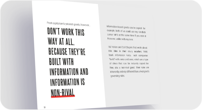 Post-capitalism’s priciest goods, however… Information-based goods can be copied—for example, both of us could use my Kendrick DON’T WORK THIS Lamar MP3 at the same time if you stole it from me, unlike with my beer. WAY AT ALL, Hal Varian and Carl Shapiro first wrote about BECAUSE THEY’RE this idea in their crazy excellent 1998 book Information Rules. Tech companies “build” with zeros and ones, which are a type BUILT WITH of ideas that can be instantly copied for free, aka a non-rival good. Their rules are INFORMATION AND inherently, entirely different than a rival good’s governing rules. INFORMATION IS NON-RIVAL 64