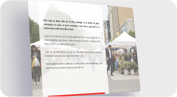 One way to deal with all of this change is to think of your company—or parts of your company—less like a pyramid or a skyscraper, and more like a tent. Look at Facebook and Google/Alphabet, how many projects do they routinely shut down, entire branches of their company that they cut off on a moment’s notice. Just as quickly things can go up, like Uber entering the catering business virtually overnight with Uber Eats. What opportunities could you scale quickly with technology, with the intention of then shutting them down? DW labs Incorporated/Shutterstock.com 111