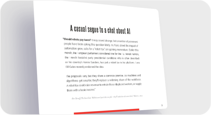 A casual segue to a chat about AI “ Should robots pay taxes? It may sound strange, but a number of prominent people have been asking this question lately. As fears about the impact of automation grow, calls for a “robot tax” are gaining momentum. Earlier this month, the European parliament considered one for the EU. Benoît Hamon, the French Socialist party presidential candidate who is often described as his country’s Bernie Sanders, has put a robot tax in his platform. Even Bill Gates recently endorsed the idea. The proposals vary, but they share a common premise. As machines and algorithms get smarter, they’ll replace a widening share of the workforce. A robot tax could raise revenue to retrain those displaced workers, or supply them with a basic income.” -Ben Tarnoff, !e Guardian, “Robots won’t just take our jobs – they’ll make the rich even richer,” March 2, 2017 95