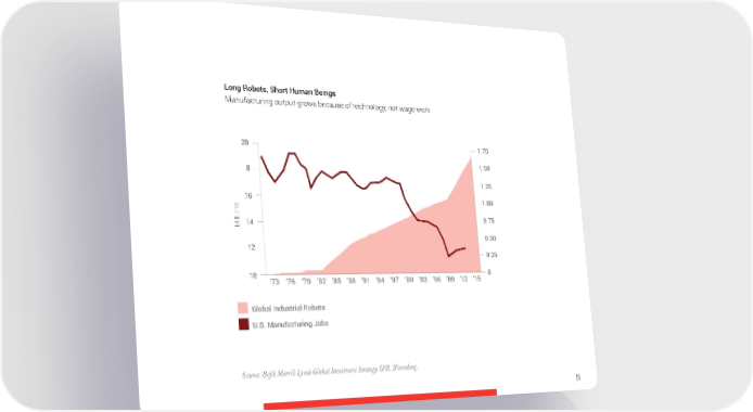 Long Robots, Short Human Beings Manufacturing output grows because of technology, not wage work 20 1.75 8 1.50 1.25 16 1.00 Millions14 0.75 0.50 12 0.25 10 ’73 ’76 ’79 ’82 ’85 ’88 ’91 ’94 ’97 ’00 ’03 ’06 ’09 ’12 ’15 0 Global Industrial Robots U.S. Manufacturing Jobs Source: BofA Merrill Lynch Global Investment Strategy, IFR, Bloomberg. 25