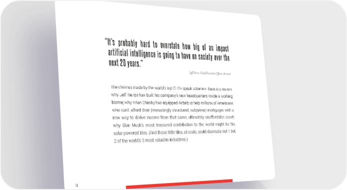 “ It’s probably hard to overstate how big of an impact artificial intelligence is going to have on society over the next 20 years.” -Jeff Bezos, Chief Executive Officer, Amazon The choices made by the world’s top CEOs speak volumes: there is a reason why Jeff Bezos has built his company’s new headquarters inside a working biome; why Brian Chesky has equipped Airbnb to help millions of Americans who can’t afford their (menacingly structured, subprime) mortgages with a new way to derive income from that same, ultimately unaffordable asset; why Elon Musk’s most treasured contribution to the world might be his solar-powered tiles. (And those little tiles, at scale, could decimate not 1 but 2 of the world’s 3 most valuable industries.) 14