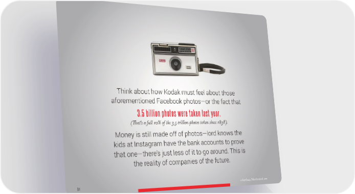 Think about how Kodak must feel about those aforementioned Facebook photos—or the fact that 3.5 billion photos were taken last year. (!at’s a full 10% of the 3.5 trillion photos taken since 1838). Money is still made off of photos—lord knows the kids at Instagram have the bank accounts to prove that one—there’s just less of it to go around. This is the reality of companies of the future. 84 urbanbuzz/Shutterstock.com
