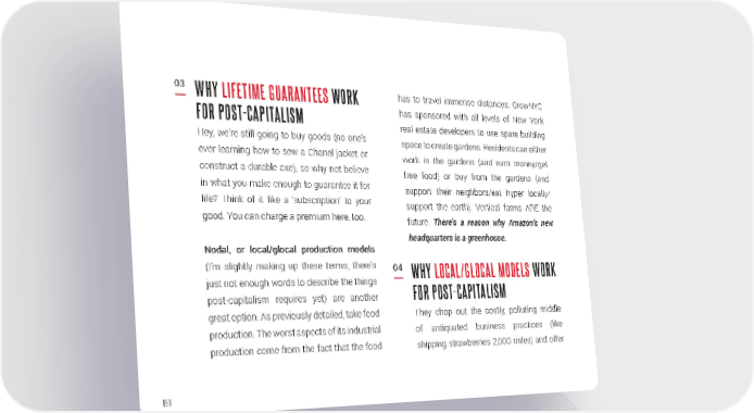 03 WHY LIFETIME GUARANTEES WORK has to travel immense distances. GrowNYC FOR POST-CAPITALISM has sponsored with all levels of New York real estate developers to use spare building Hey, we’re still going to buy goods (no one’s space to create gardens. Residents can either ever learning how to sew a Chanel jacket or work in the gardens (and earn money/get construct a durable axe), so why not believe free food) or buy from the gardens (and in what you make enough to guarantee it for support their neighbors/eat hyper locally/ life? Think of it like a ‘subscription’ to your support the earth). Vertical farms ARE the good. You can charge a premium here, too. future. There’s a reason why Amazon’s new headquarters is a greenhouse. Nodal, or local/glocal production models (I’m slightly making up these terms, there’s 04 WHY LOCAL/GLOCAL MODELS WORK just not enough words to describe the things post-capitalism requires yet) are another FOR POST-CAPITALISM great option. As previously detailed, take food They chop out the costly, polluting middle production. The worst aspects of its industrial of antiquated business practices (like production come from the fact that the food shipping strawberries 2,000 miles) and offer 150