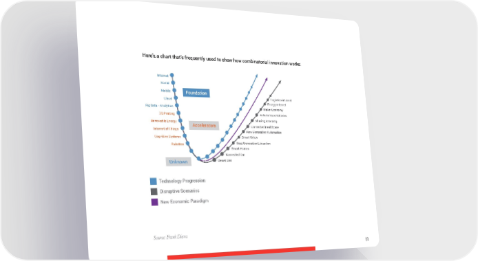 Here’s a chart that’s frequently used to show how combinatorial innovation works: Internet Social Mobile Foundation Cloud Logistics internet Energy internet Big Data - Analytics Maker Economy 3D Printing Autonomous Vehicles Renewable Energy Sharing Economy Accelerators Connected Healthcare Internet of Things New Generation Automation Cognitive Systems Smart Cities Robotics Next Generation Education Smart Homes Connected Car Unknown Smart Grid Technology Progression Disruptive Scenarios New Economic Paradigm Source: Frank Diana 69