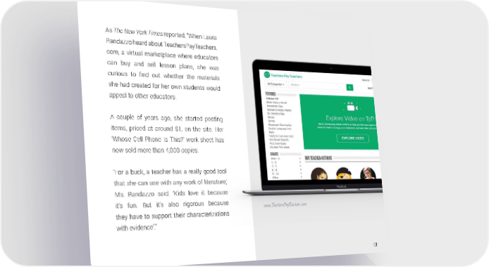 As The New York Times reported, “When Laura Randazzo heard about TeachersPayTeachers. com, a virtual marketplace where educators can buy and sell lesson plans, she was curious to find out whether the materials she had created for her own students would appeal to other educators. A couple of years ago, she started posting items, priced at around $1, on the site. Her ‘Whose Cell Phone Is This?’ work sheet has now sold more than 4,000 copies. ‘For a buck, a teacher has a really good tool that she can use with any work of literature,’ Ms. Randazzo said. ‘Kids love it because it’s fun. But it’s also rigorous because www.TeachersPayTeachers.com they have to support their characterizations with evidence’.” 131