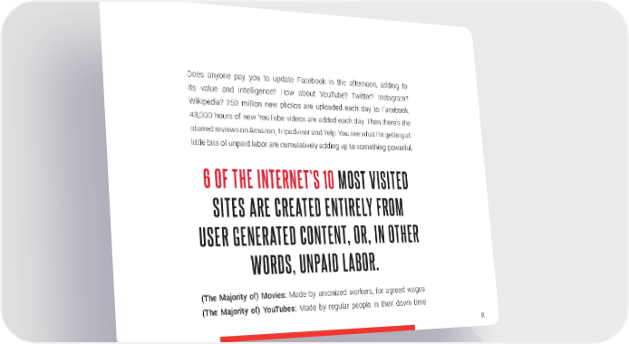 Does anyone pay you to update Facebook in the afternoon, adding to its value and intelligence? How about YouTube? Twitter? Instagram? Wikipedia? 250 million new photos are uploaded each day to Facebook. 43,000 hours of new YouTube videos are added each day. Then there’s the starred reviews on Amazon, Tripadvisor and Yelp. You see what I’m getting at: little bits of unpaid labor are cumulatively adding up to something powerful. 6 OF THE INTERNET’S 10 MOST VISITED SITES ARE CREATED ENTIRELY FROM USER GENERATED CONTENT, OR, IN OTHER WORDS, UNPAID LABOR. (The Majority of) Movies: Made by unionized workers, for agreed wages (The Majority of) YouTubes: Made by regular people in their down time 81