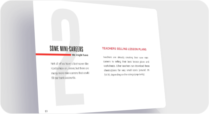 SOME MINI-CAREERS TEACHERS SELLING LESSON PLANS We might have Teachers are already creating their own mini- Not all of us have a last name like careers in selling their best lesson plans and Kardashian or Jenner, but there are worksheets. Other teachers can download these many more mini-careers that could sheets/plans for very small costs (around .99- $4.99, depending on the ratings/popularity). fill our bank accounts. 130