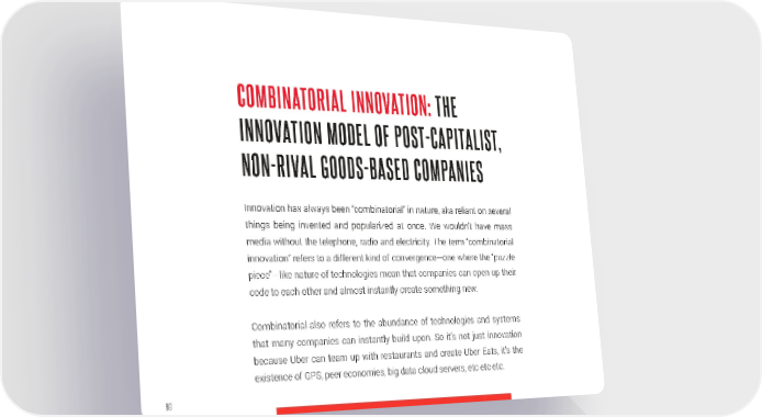 COMBINATORIAL INNOVATION: THE INNOVATION MODEL OF POST-CAPITALIST, NON-RIVAL GOODS-BASED COMPANIES Innovation has always been “combinatorial” in nature, aka reliant on several things being invented and popularized at once. We wouldn’t have mass media without the telephone, radio and electricity. The term “combinatorial innovation” refers to a different kind of convergence—one where the “puzzle piece”—like nature of technologies mean that companies can open up their code to each other and almost instantly create something new. Combinatorial also refers to the abundance of technologies and systems that many companies can instantly build upon. So it’s not just innovation because Uber can team up with restaurants and create Uber Eats, it’s the existence of GPS, peer economies, big data cloud servers, etc etc etc. 68