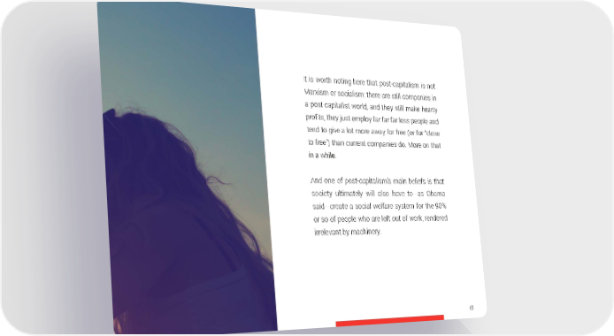 It is worth noting here that post-capitalism is not Marxism or socialism: there are still companies in a post-capitalist world, and they still make hearty profits, they just employ far far far less people and tend to give a lot more away for free (or for “close to free”) than current companies do. More on that in a while. And one of post-capitalism’s main beliefs is that society ultimately will also have to—as Obama said—create a social welfare system for the 90% or so of people who are left out of work, rendered irrelevant by machinery. 43