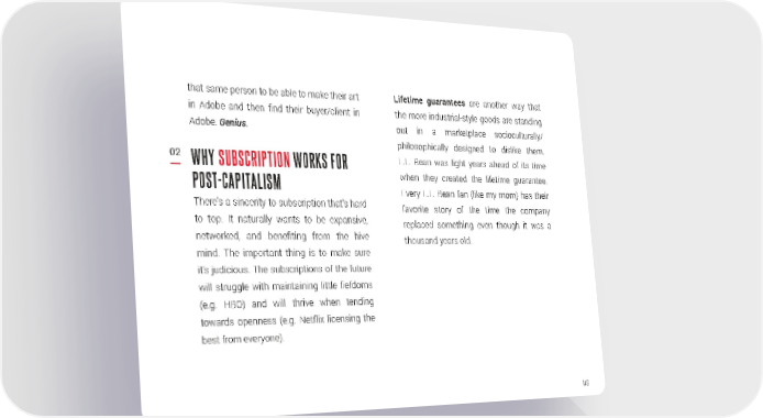 that same person to be able to make their art Lifetime guarantees are another way that in Adobe and then find their buyer/client in the more industrial-style goods are standing Adobe. Genius. out in a marketplace socioculturally/ philosophically designed to dislike them. 02 WHY SUBSCRIPTION WORKS FOR L.L. Bean was light years ahead of its time POST-CAPITALISM when they created the lifetime guarantee. Every L.L. Bean fan (like my mom) has their There’s a sincerity to subscription that’s hard favorite story of the time the company to top. It naturally wants to be expansive, replaced something even though it was a networked, and benefiting from the hive thousand years old. mind. The important thing is to make sure it’s judicious. The subscriptions of the future will struggle with maintaining little fiefdoms (e.g. HBO) and will thrive when tending towards openness (e.g. Netflix licensing the best from everyone). 149