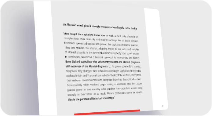In Harari’s words (and I strongly recommend reading the entire book): “Marx forgot the capitalists know how to read. At first only a handful of disciples took Marx seriously and read his writings. But as these socialist firebrands gained adherents and power, the capitalists became alarmed. They too perused Das Kapital, adopting many of the tools and insights of Marxist analysis. In the twentieth century everybody from street urchins to presidents embraced a Marxist approach to economics and history. Even diehard capitalists who vehemently resisted the Marxist prognosis still made use of the Marxist diagnosis. […] As people adopted the Marxist diagnosis, they changed their behavior accordingly. Capitalists in countries such as Britain and France strove to better the lot of the workers, strengthen their national consciousness and integrate them into the political system. Consequently, when workers began voting in elections and the Labour gained power in one country after another, the capitalists could sleep soundly in their beds. As a result, Marx’s predictions came to naught. This is the paradox of historical knowledge.” 77