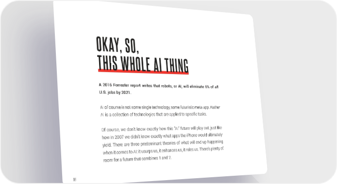 OKAY, SO, THIS WHOLE AI THING A 2016 Forrester report writes that robots, or AI, will eliminate 6% of all U.S. jobs by 2021. AI of course is not some single technology, some futuristic meta-app. Rather AI is a collection of technologies that are applied to specific tasks. Of course, we don’t know exactly how this “AI” future will play out, just like how in 2007 we didn’t know exactly what apps the iPhone would ultimately yield. There are three predominant theories of what will end up happening when it comes to AI: it usurps us, it enhances us, it rules us. There’s plenty of room for a future that combines 1 and 2. 96