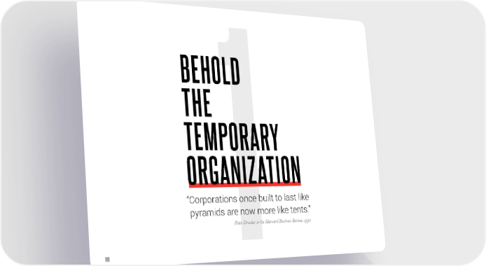 OgilvyRED Future of Work Flipbook Page 103 Page 105BEHOLD THE TEMPORARY ORGANIZATION “ Corporations once built to last like pyramids are now more like tents.” -Peter Drucker to the Harvard Business Review, 1992 110