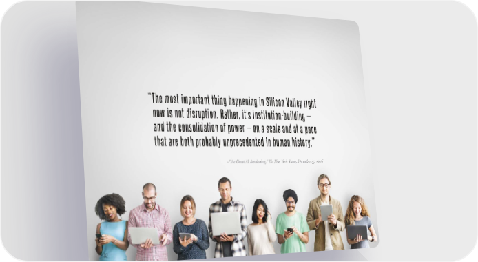 “ The most important thing happening in Silicon Valley right now is not disruption. Rather, it’s institution-building — and the consolidation of power — on a scale and at a pace that are both probably unprecedented in human history.” -“!e Great AI Awakening,” !e New York Times, December 15, 2016 92