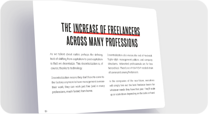 THE INCREASE OF FREELANCERS ACROSS MANY PROFESSIONS As we talked about earlier, perhaps the defining Decentralization also means the end of Frederick trait of shifting from capitalism to post-capitalism Taylor-style management policies and company is that we decentralize. This decentralization is, of structures. Networked professionals are far less course, thanks to technology. hierarchical. There’s no VP-SVP-EVP needed chain of command among freelancers. Decentralization means they don’t have to come to the factory anymore to have management oversee In the companies of the near-future, executives their work; they can work just fine (and in many will simply hire out the best freelance teams for professions, much faster) from home. whatever needs they have that year. They’ll scale up or scale down depending on the tasks at hand. 104