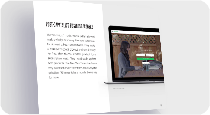 POST-CAPITALIST BUSINESS MODELS The “freemium” model works extremely well in a knowledge economy. Evernote is famous for pioneering freemium software. They make a basic (very good) product and give it away for free. Then there’s a better product for a subscription cost. They continually update both products. The New York Times has been very successful with freemium, too. Everyone gets their 10 free articles a month. Some pay for more. www.evernote.com 147