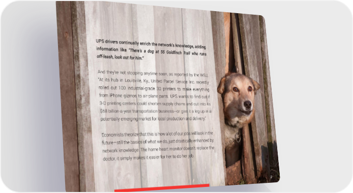 UPS drivers continually enrich the network’s knowledge, adding information like “There’s a dog at 55 Goldfinch Trail who runs off-leash, look out for him.” And they’re not stopping anytime soon, as reported by the WSJ, “At its hub in Louisville, Ky., United Parcel Service Inc. recently rolled out 100 industrial-grade 3D printers to make everything from iPhone gizmos to air-plane parts. UPS wants to find out if 3-D printing centers could shorten supply chains and cut into its $58 billion-a-year transportation business—or give it a leg up in a potentially emerging market for local production and delivery.” Economists theorize that this is how a lot of our jobs will look in the future—still the basics of what we do, just drastically enhanced by network knowledge. The home heart monitor doesn’t replace the doctor, it simply makes it easier for her to do her job. 137