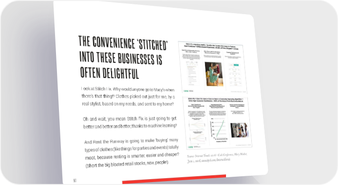 THE CONVENIENCE ‘STITCHED’ INTO THESE BUSINESSES IS OFTEN DELIGHTFUL Look at Stitch Fix. Why would anyone go to Macy’s when there’s that thing!? Clothes picked out just for me, by a real stylist, based on my needs, and sent to my home? Oh and wait, you mean Stitch Fix is just going to get better and better and better, thanks to machine learning? And Rent the Runway is going to make ‘buying’ many types of clothes (like things for parties and events) totally moot, because renting is smarter, easier and cheaper? Source: Internet Trends 2016 – Code Conference, Mary Meeker, (Short the big bloated retail stocks, now, people!) June 1, 2016, www.kpcb.com/InternetTrends 58