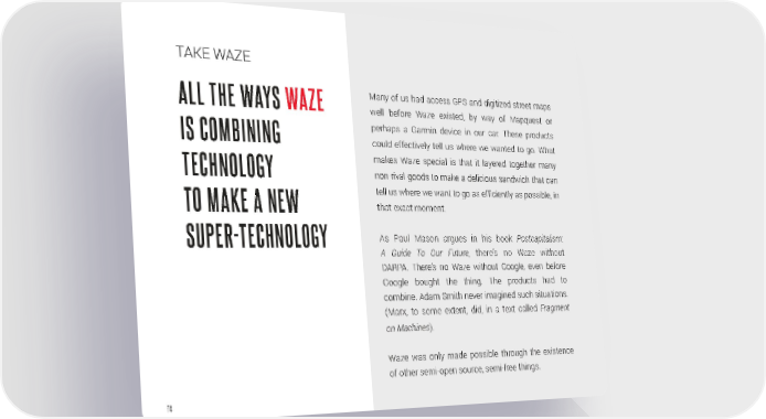 TAKE WAZE ALL THE WAYS WAZE Many of us had access GPS and digitized street maps well before Waze existed, by way of Mapquest or IS COMBINING perhaps a Garmin device in our car. These products could effectively tell us where we wanted to go. What makes Waze special is that it layered together many TECHNOLOGY non-rival goods to make a delicious sandwich that can tell us where we want to go as efficiently as possible, in TO MAKE A NEW that exact moment. SUPER-TECHNOLOGY As Paul Mason argues in his book Postcapitalism: A Guide To Our Future, there’s no Waze without DARPA. There’s no Waze without Google, even before Google bought the thing. The products had to combine. Adam Smith never imagined such situations. (Marx, to some extent, did, in a text called Fragment on Machines). Waze was only made possible through the existence of other semi-open source, semi-free things. 74