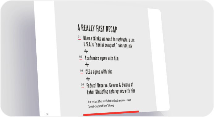 A REALLY FAST RECAP 01 Obama thinks we need to restructure the U.S.A.’s “social compact,” aka society 02 Academics agree with him 03 CEOs agree with him 04 Federal Reserve, Census & Bureau of Labor Statistics data agrees with him So what the hell does that mean—that ‘post-capitalism’ thing 34